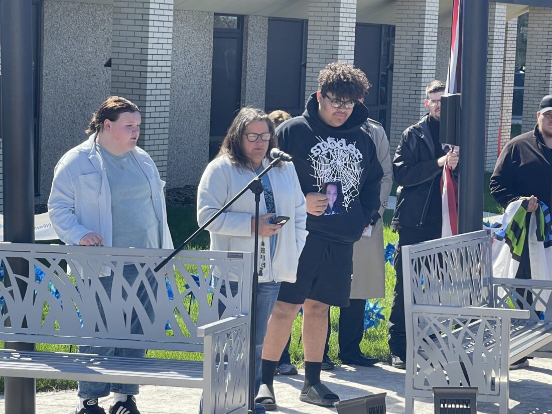 DONATE LIFE — Jennifer Orlando speaks about her late daughter, Alicia Orlando, during Tuesday’s Donate Life flag-raising ceremony at Trinity Medical Center West. Joining her were Alicia’s daughter, Peyton Ewing, and son, Dominic Hines. Photo by Ross Gallabrese.