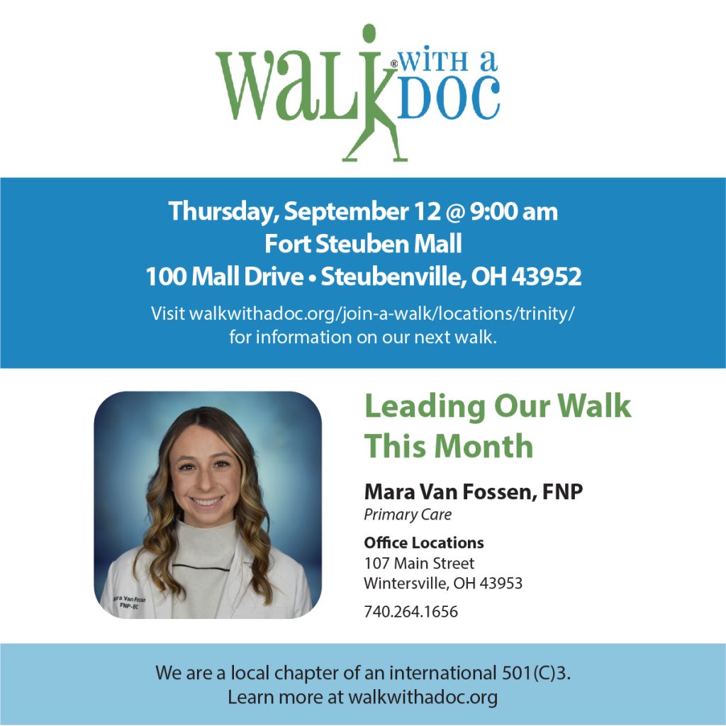 You have two opportunities. This Thursday, September 12, at the Fort Steuben Mall, we’ll be walking with Mara Van Fossen, Family Nurse Practitioner (FNP).