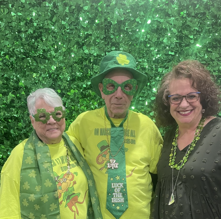 Trudy Wilson (R), Manager, Senior Adult Services, Trinity Health System, poses with a couple attending Prime Time Center’s St. Patrick’s Day party last year.