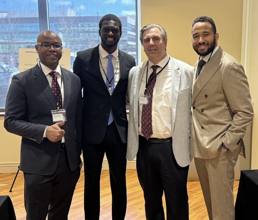Triston Smith, M.D., Interventional Cardiologist; John Schirger, M.D., Interventional Cardiologist; and Gregory Suero, M.D., FSCAI, Interventional and Structural Cardiologist, pose with Olympian Kirani James (center), featured speaker at the 2nd Annual Cardiovascular Symposium, held Friday, Feb. 23, 2024, at the AC Marriott – Southpointe in Canonsburg, Pa. It was presented as a joint providership between Allegheny General Hospital and Trinity Health System.
