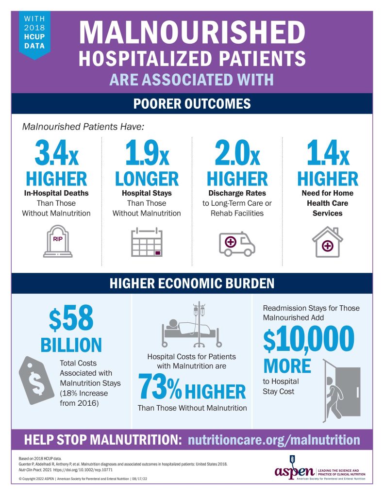 ASPEN reports that malnourished patients have 3.4 times higher in-hospital deaths and 1.9 times longer hospital stays than those without malnutrition. The discharge rates to long-term care or rehab facilities are two times higher for malnourished patients, and they have a 1.4 times higher need for home health services.